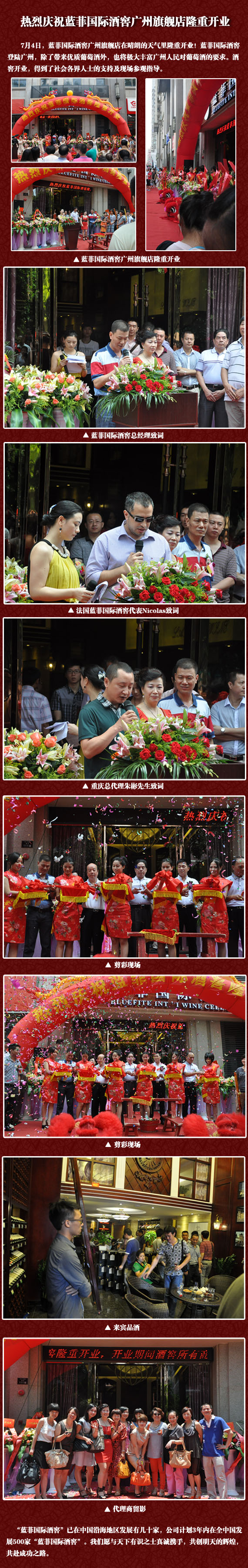 7月4日,藍菲國際酒窖廣州旗艦店在晴朗的天氣里隆重開業(yè)!藍菲國際酒窖登陸廣州,除了帶來優(yōu)質葡萄酒外,也將極大豐富廣州人民對葡萄酒的要求。酒窖開業(yè),得到了社會各界人士的支持及現(xiàn)場參觀指導。