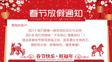 尊敬的藍菲代理商朋友們: 新年的鐘聲即將敲響,根據(jù)國家春節(jié)假期通知及藍菲公司的實際情況, 確定于2018年2月9日-2月22日,共14天,為藍菲酒業(yè)春節(jié)假期,于2018年2月23日(正月初八)正式上班,請好朋友們悉知。 同時在此提前恭祝,新春快樂! 2017年是非同尋...